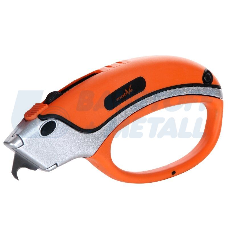 Острието на ножа e с форма на кука. Корпуса е с предпазител за ръката и място за съхранение на едно резервно острие.