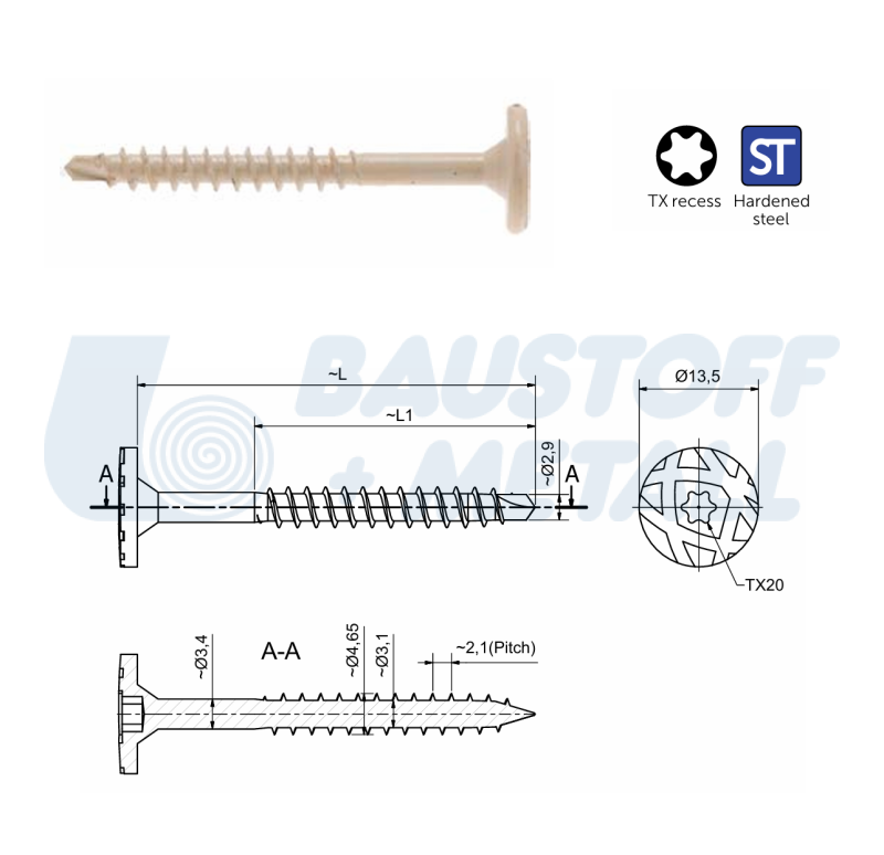 Глава: Ø13.8 мм плоска глава с вдлъбнатина TX20
