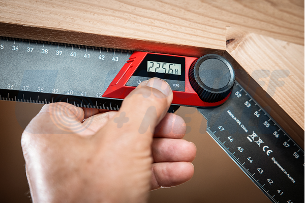 Основният лъч се поставя плътно към ръба на детайла, а ъгълът се измерва или маркира с помощта на другия лъч.