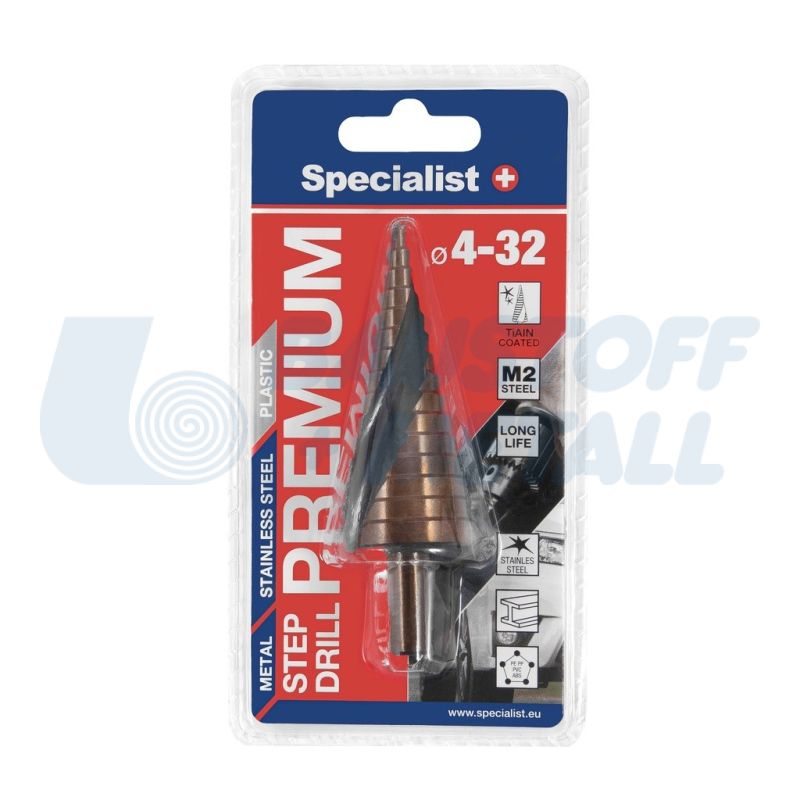 Стъпаловидно свредло Ø4-32 SPECIALIST, изработено от М2 стомана - осигурява издръжливост и здравина на свредлото, титаниевото покритие (TIN) намалява ефекта на триене - свредлото пробива по-бързо и не се нагорещява много, всяка стъпка е заточена за пробиване и автоматично почистване, пасва здраво в патронника на електроинструмента и не приплъзва, за пробиване на цветни и леки метали, ламарина от неръждаема стомана, на стоманена ламарина и пластмаси.